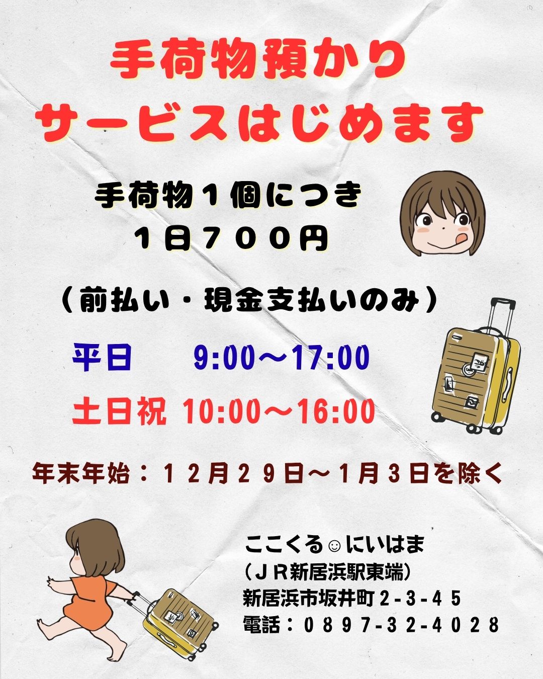Kokokuru ☺ Niihama will start a service to store bulky baggage such as large suitcases and backpacks!