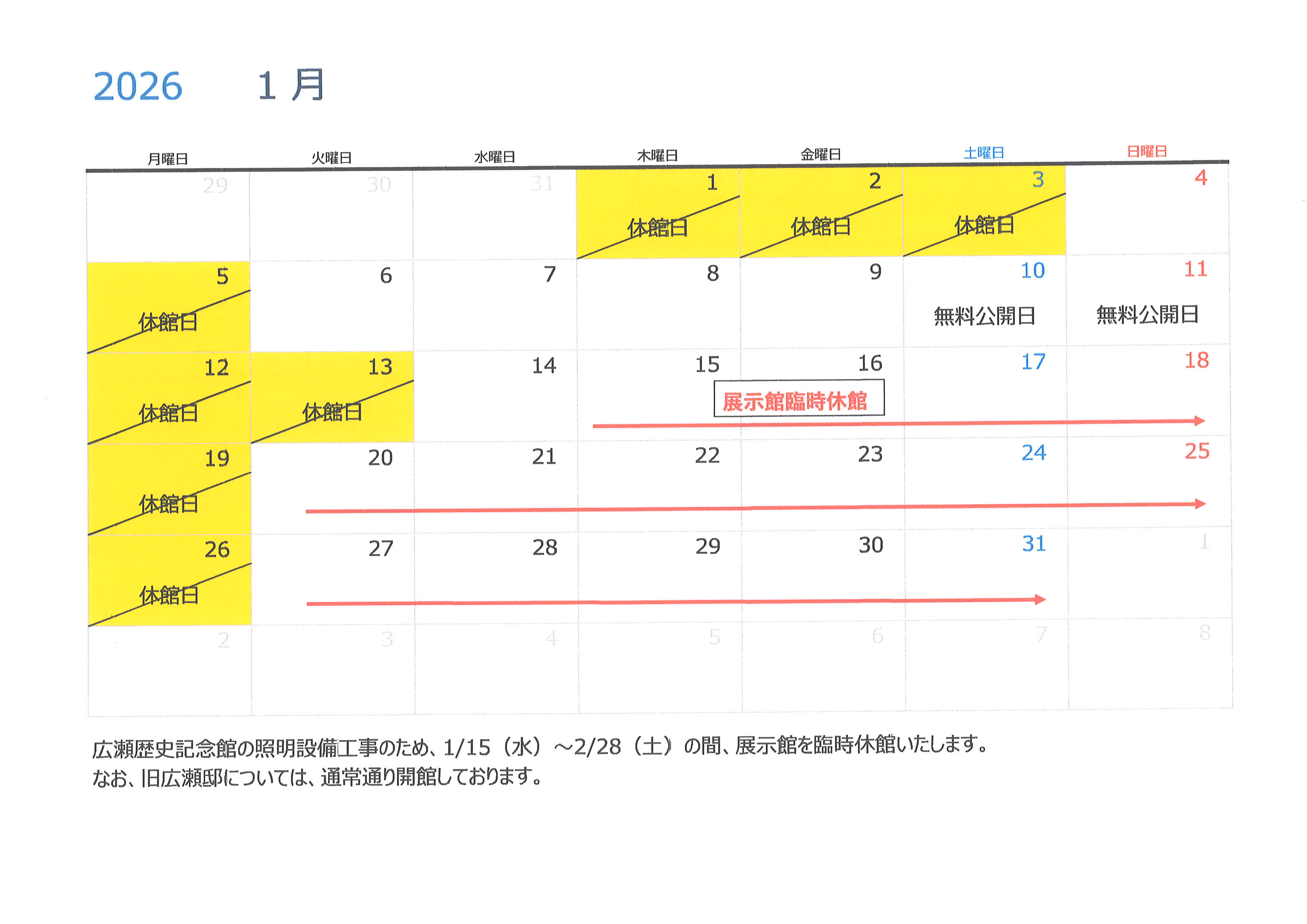 Due to lighting equipment construction work at the Hirose History Memorial Museum, the exhibition hall will be temporarily closed from Wednesday, January 15th to Saturday, February 28th.